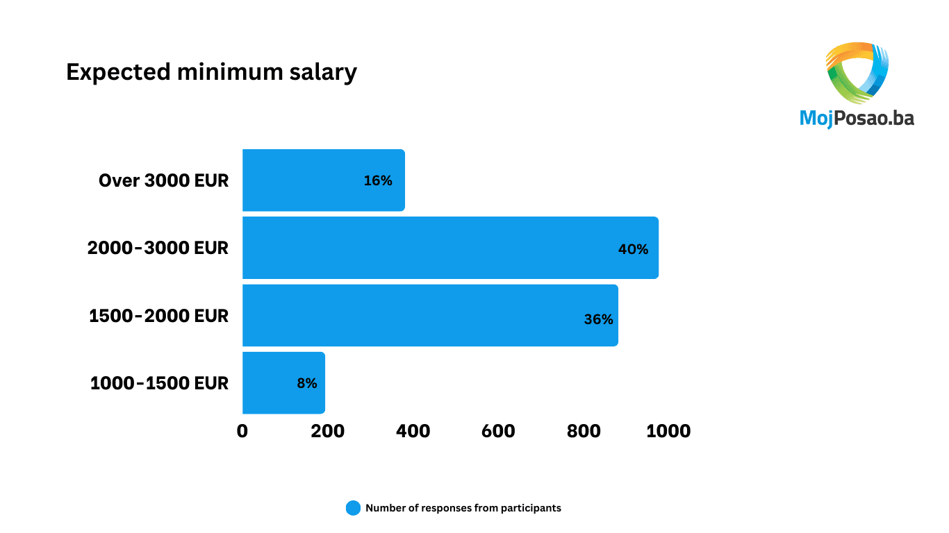 According to the research results, the majority of respondents are willing to work permanently in neighboring countries, while many are unsure if they would ever return to Bosnia and Herzegovina. Most respondents expect a minimum netto salary ranging from 2,000 to 3,000 euros. These expectations align with their desire for better living and working conditions.